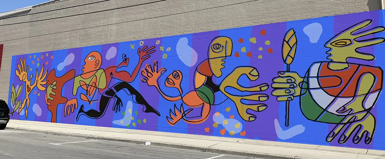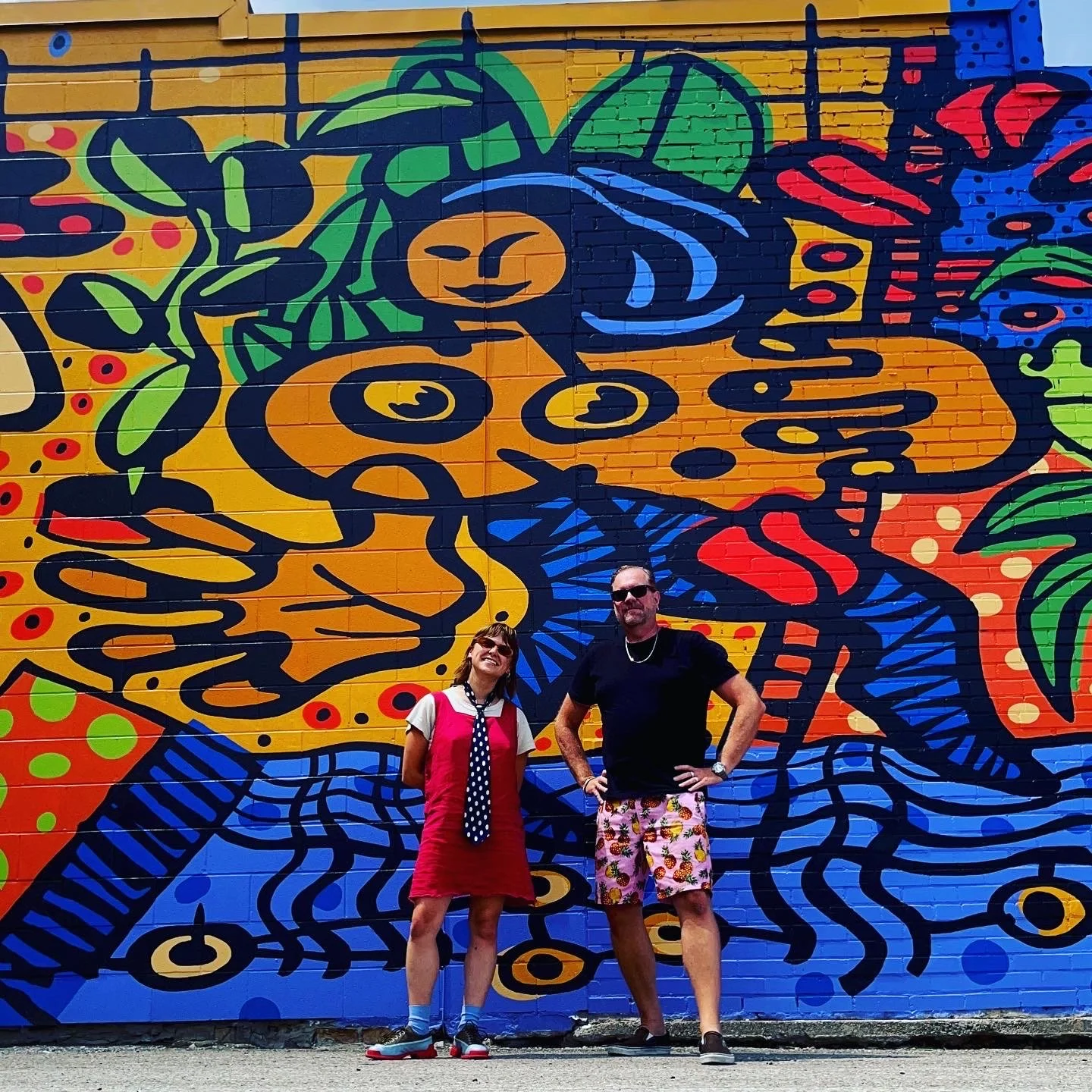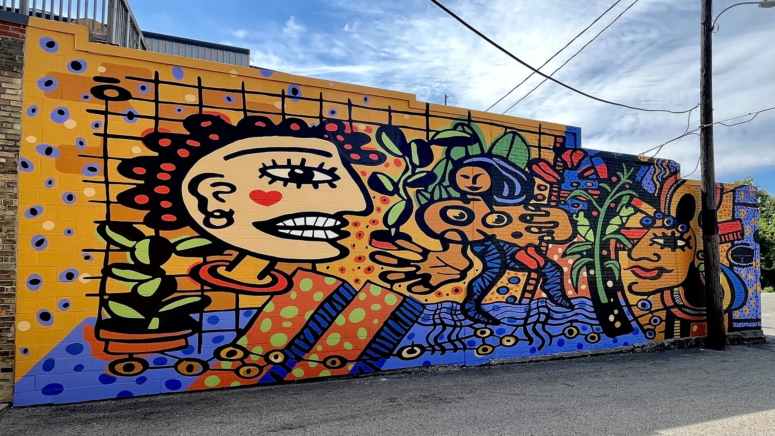 St Thomas is in the heart of South Western Ontario farmland that grows an incredible diverse selection of produce. It also employs thousands on migrant workers bringing in wonderful and colourful cultures hence the artwork referencing Latin and Caribbean nuances. The work speaks also of inclusivity, diversity and our community celebrating each other. Its a street party!